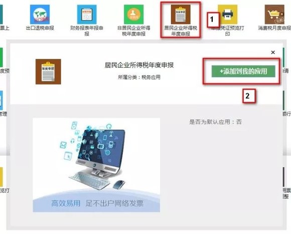 找到并点击“居民企业所得税年度申报”APP。点击添加到“我的应用”,系统提示应用添加成功。