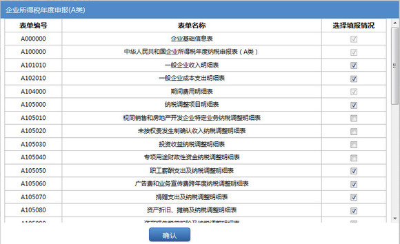 *二步:填写《企业所得税年度申报A类表单》,《表单》的填写有两种途径,一是《A000000企业基础信息表》保存后系统自动跳出《表单》供纳税人填写;二是纳税人可点击列表页面右上角“表单勾选”按钮填写。