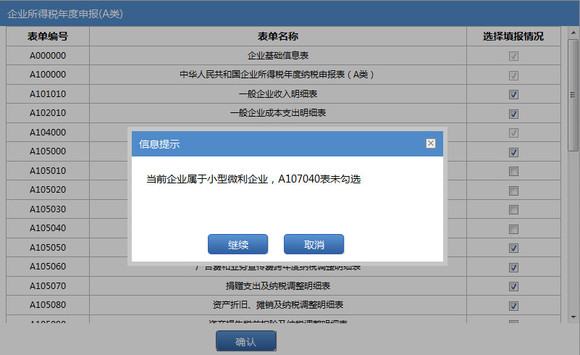 注意事项:后续《000000企业基础信息表》修改后保存的同时会给出《表单》供勾选,用户根据实际情况重新进行表单勾选,原来勾选的表单所填写的数据会保留。表单勾选完成点击确认,系统会根据用户基础信息表的填报情况,对报表勾选进行提示,用户可根据自己实际情况进行判断,如需增加相应表单,点击取消,再勾选相应表单之后确定。