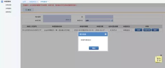 所有报表填写完成,数据核对无误后,点击“申报”按钮,如有错误,系统会给出错误提示信息,用户(纳税人)可根据提示或校验信息修改后重新申报。